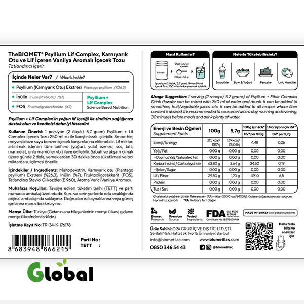 بيوميت Psyllium + Lif Complex هو مكمل غذائي يحتوي على مستخلص الكتان (Plantago ovata)، إنولين (بروبيوتيك)، و فركتوأوليغوساكاريد (FOS) لدعم صحة الجهاز الهضمي من خلال زيادة محتوى الألياف.